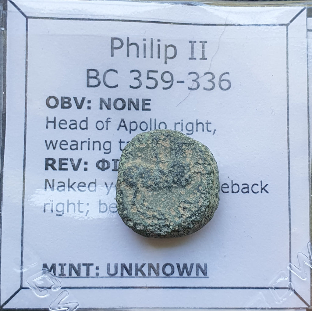 Up for auction is a Greek bronze ae16 coin from Macedonian King Philip II from 359-336 BC.