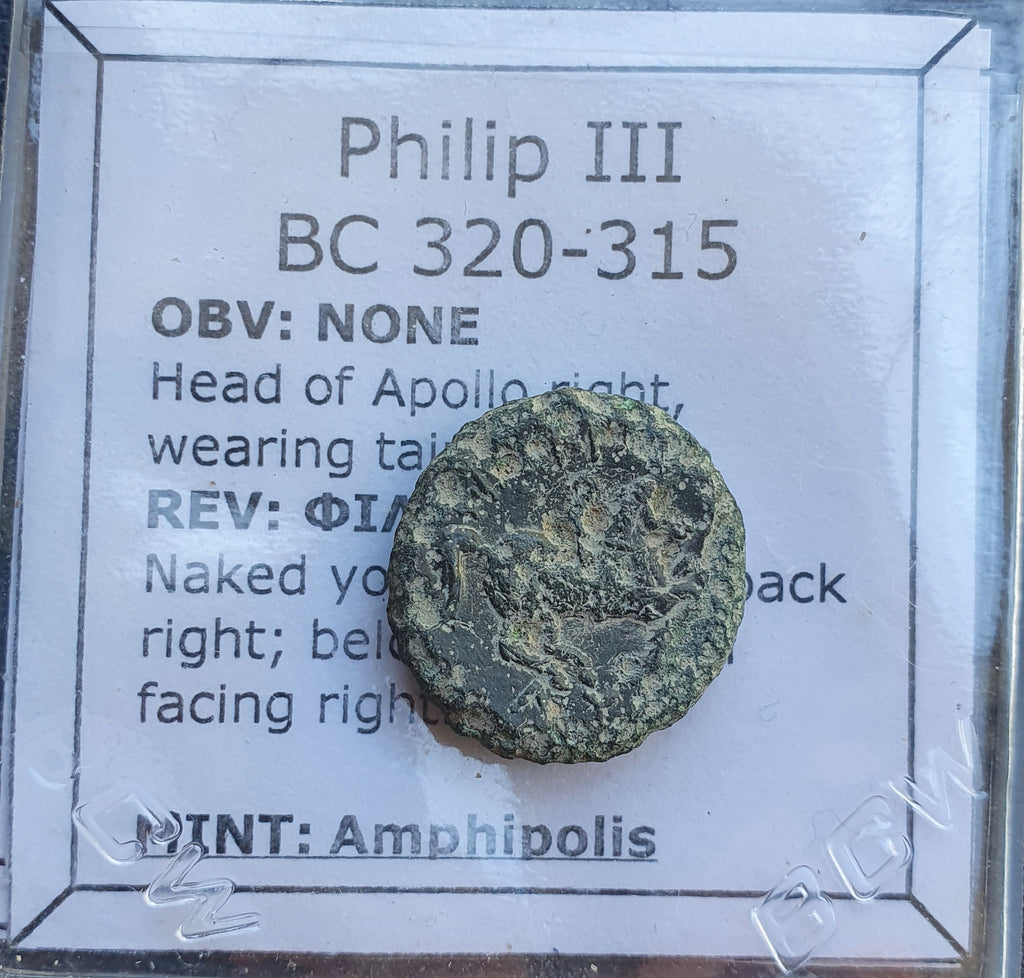 Up for auction is a Greek bronze ae18 coin from Macedonian King Philip III from 320-315 BC.