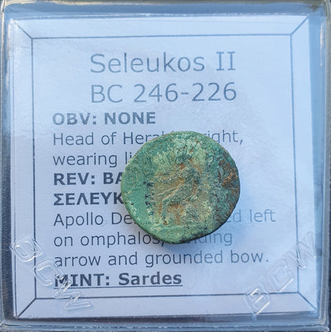 Up for auction is a Greek bronze ae14 coin from Seleucid King Seleukos II from 246-226 BC.
