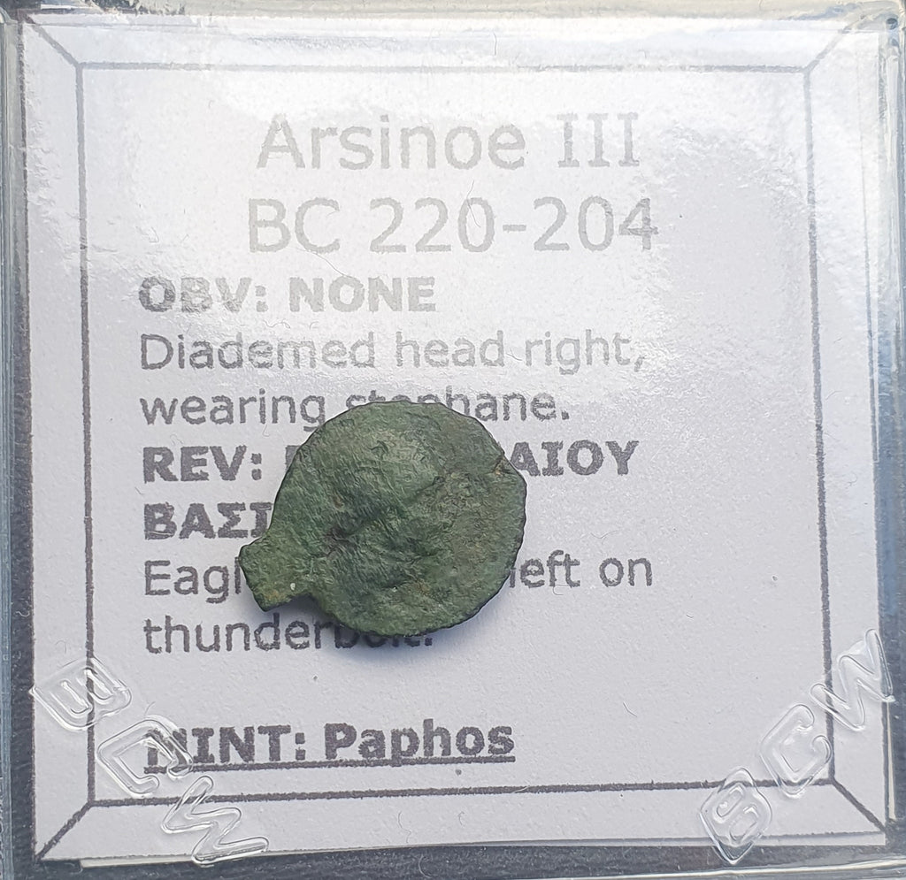 Up for auction is a Greek Ptolemaic bronze coin of Queen Arsinoe III, 220-204 BC