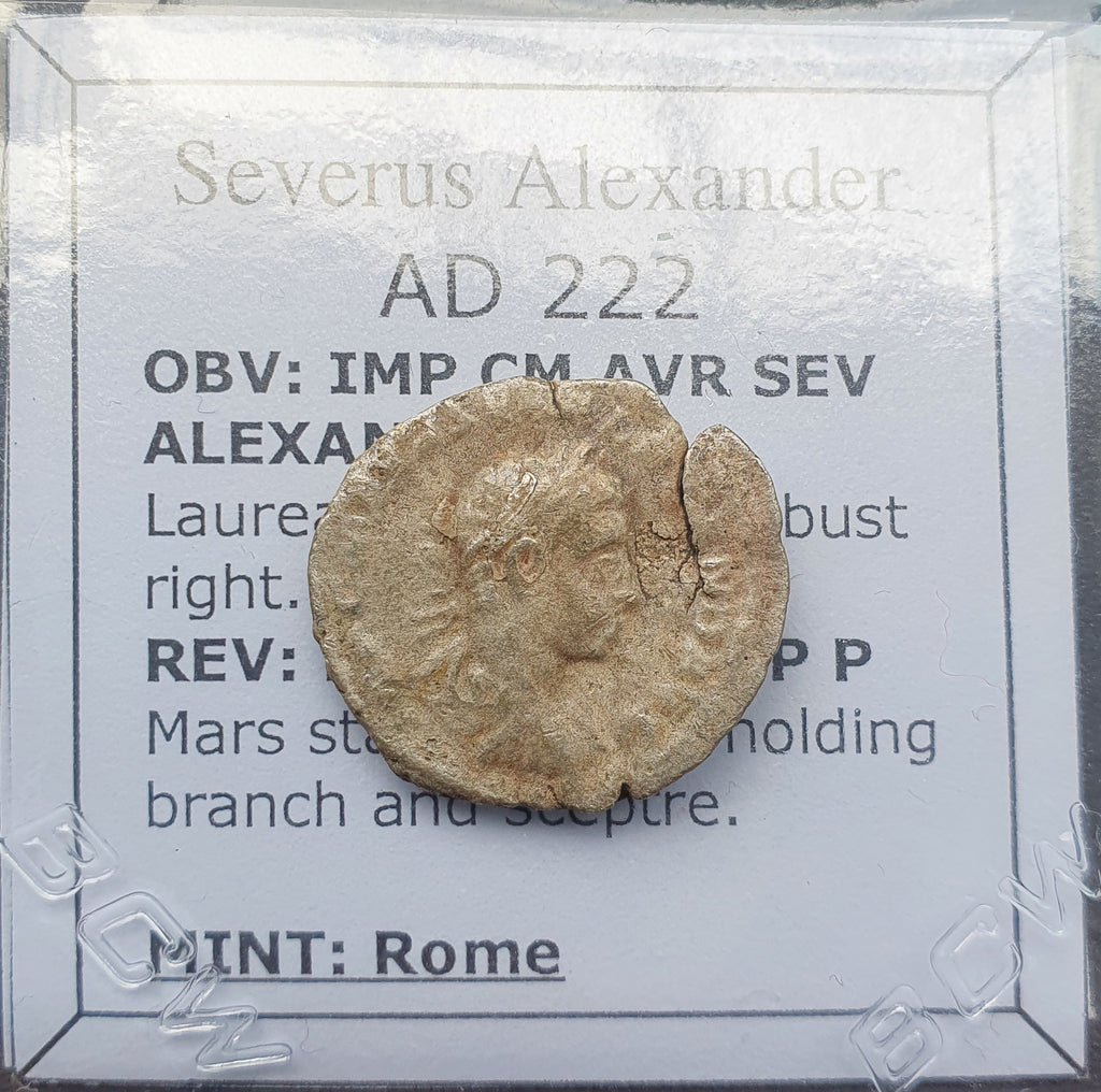 Roman silver denarius coin of Severus Alexander from 222 AD