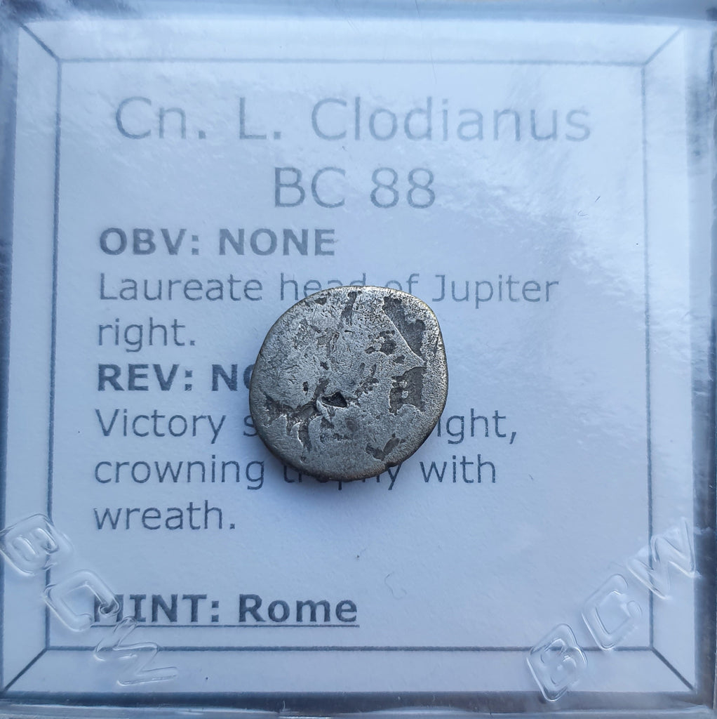 Up for auction is a Roman Republican quinarius coin of Cn. L. Clodianus from 88 BC