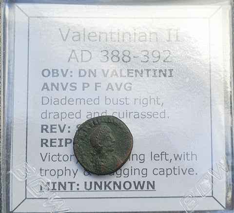 Up for auction is a Roman Bronze coin issued by Valentinian II from 388-392 AD