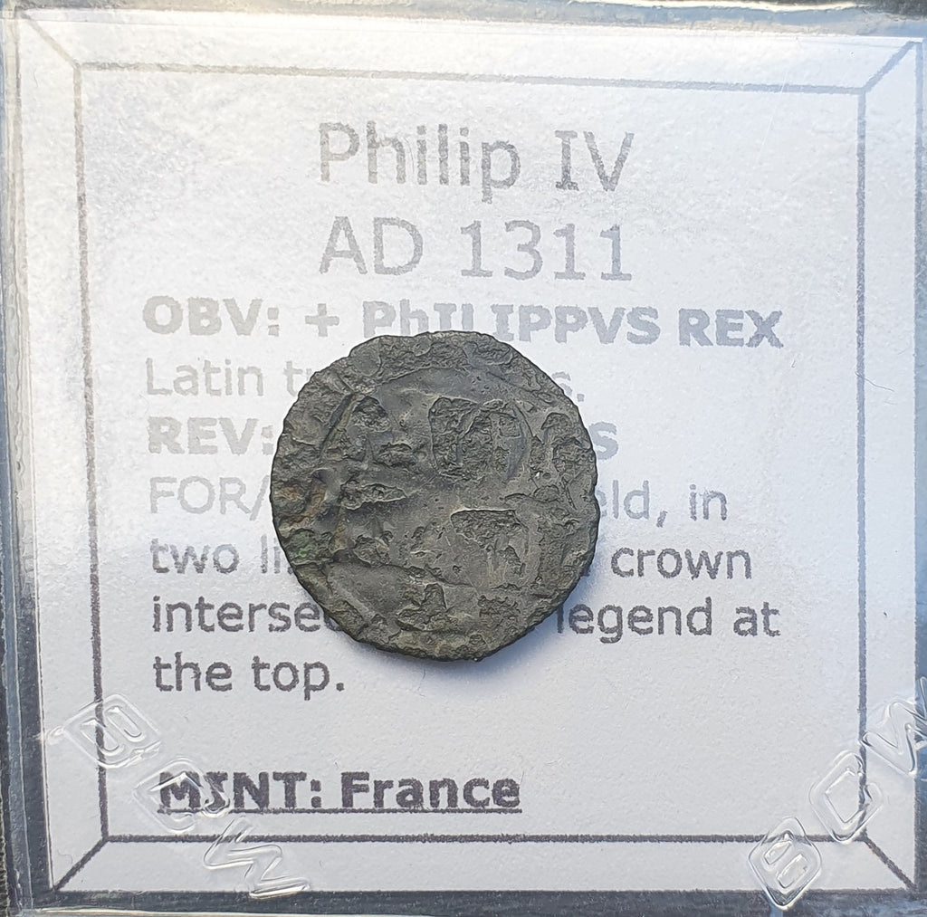 Up for auction is a French silver bilion Parisis coin of Philip IV from 1311 AD