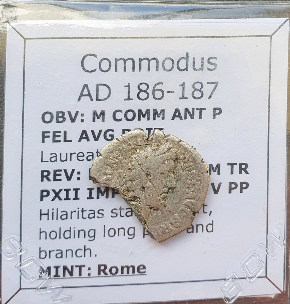 Up for auction is a Roman silver denarius coin of Commodus from 186-187 AD