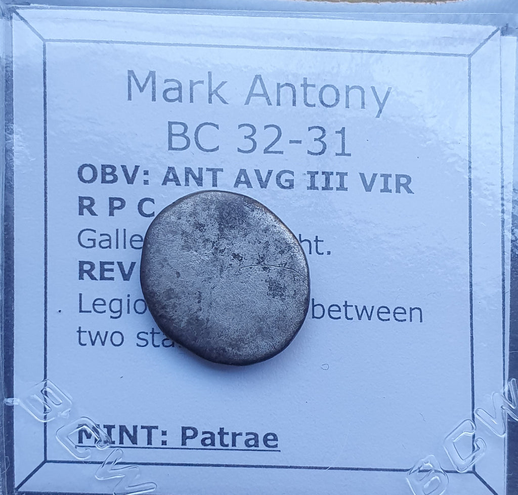 Up for auction is a Roman Republican silver denarius of Mark Antony from 32-31 BC