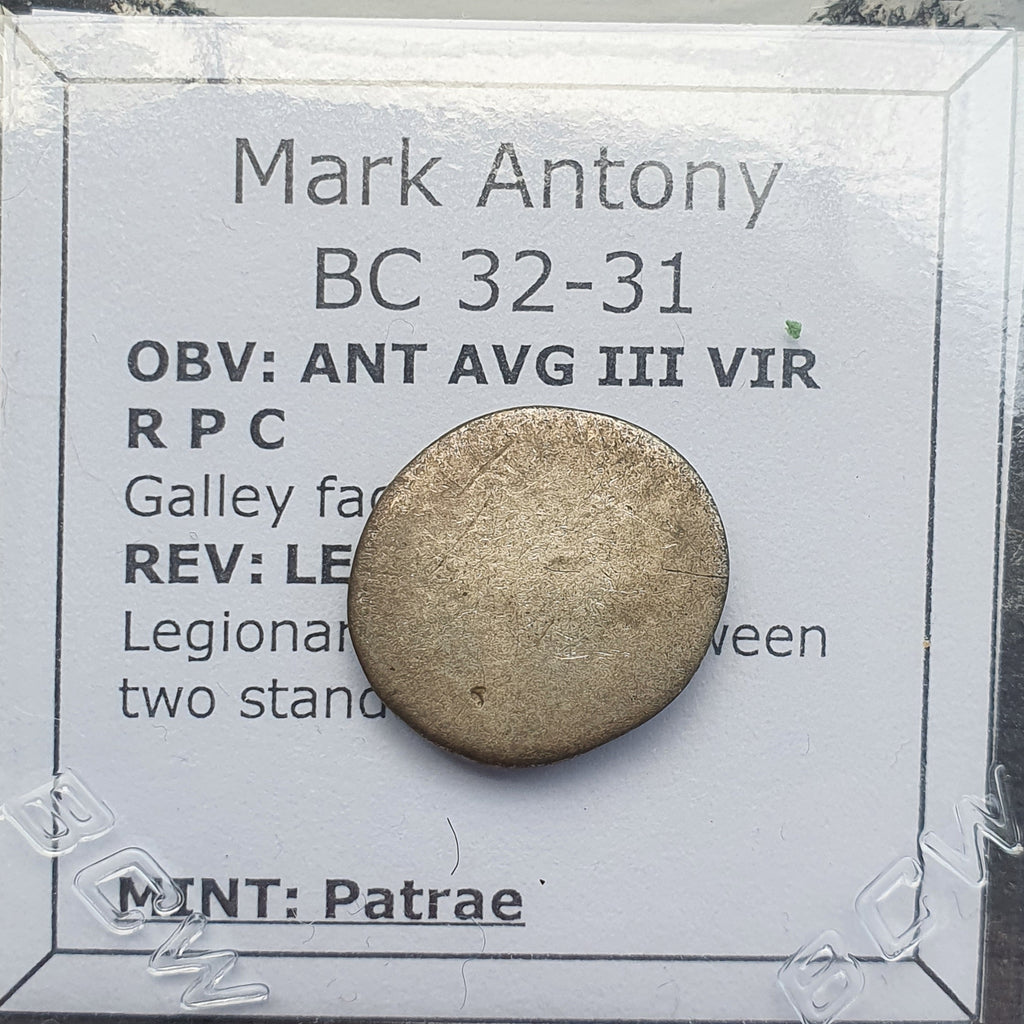 Up for auction is a Roman Republican silver denarius of Mark Antony from 32-31 BC