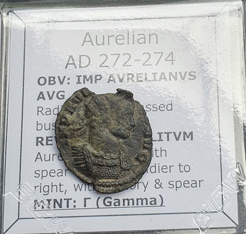 -Aurelian on left, with spear & globe, soldier to right, with Victory & spear